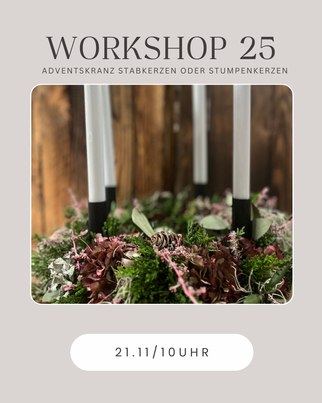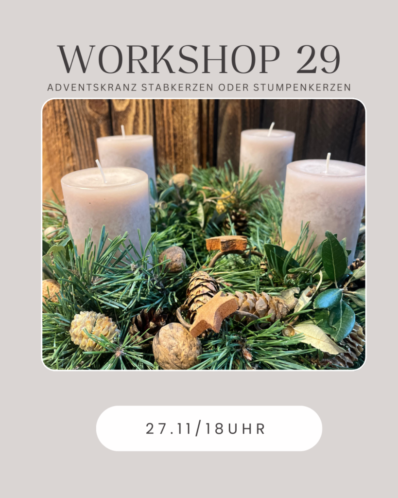 Wir fertigen einen Kranz aus verschiedenen. Grün, Moos und Naturmaterialien für die Türe oder den Tisch.